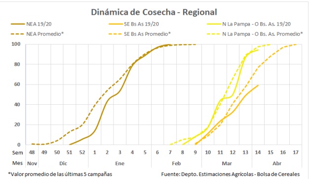 Se cosechó el 82,8 % del área. El progreso intersemanal fue de 9,1 pp y se mantiene una demora interanual de -3,6 pp. El rinde medio nacional es de 22 qq/Ha y se mantiene la proyección de producción en 3,4 MTn.