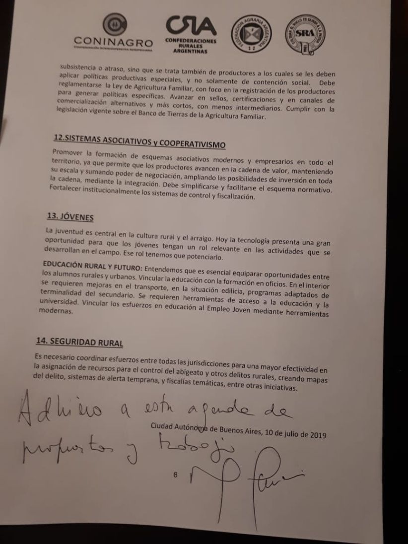 Para la reunión con el Presidente, la expectativa rural estaba puesta en algún compromiso por parte de Macri en cuanto a que los lineamientos elaborados por la mesa de enlace se incorporen a la plataforma electoral del oficialismo. Lograron de puño y letra la adhesión de Macri.