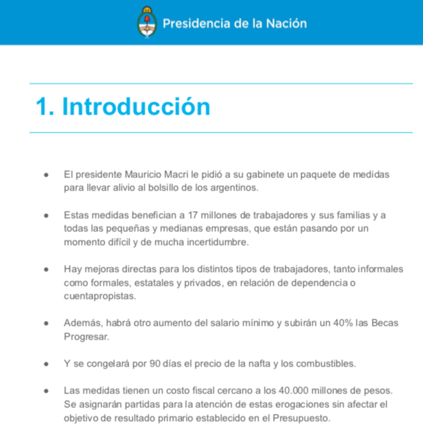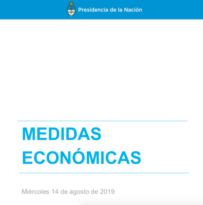 Tras el contundente triunfo del kirchnerismo en las primarias,Mauricio Macri anunció un paquete de medidas económicaspara paliar el efecto de la devaluación y llevar “alivio” a 17 millones de trabajadores y familias. El Presidente pidió “disculpas” por sus expresiones durante la conferencia de prensa del lunes pasado, cuando responsabilizó al kirchnerismo por la reacción de los mercados y la suba del dólar. “Respeto profundamente la decisión de los argentinos”, sostuvo en un giro de su postura.