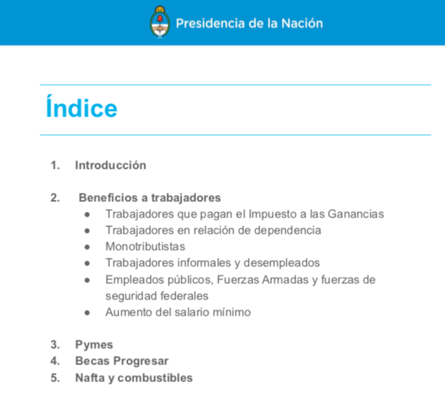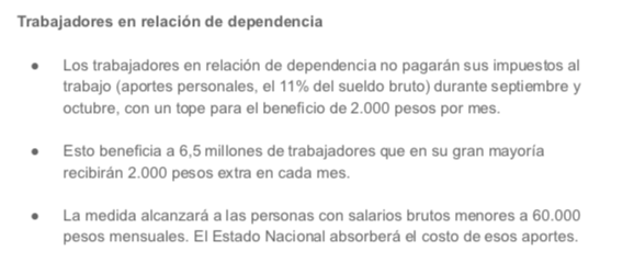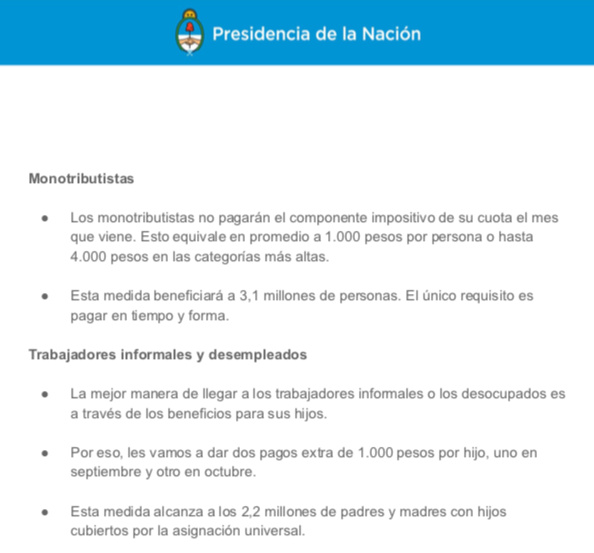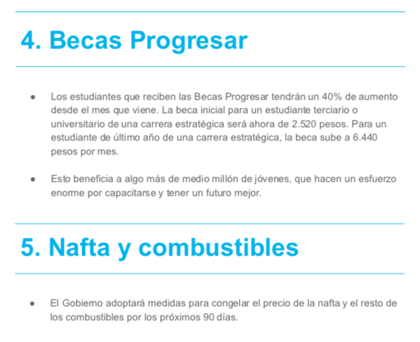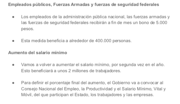 En un mensaje grabado desde la quinta de Olivos, el Presidente anunció un congelamiento del precio de la nafta durante 90 días; dos “pagos extra”de Asignación Universal por Hijo (AUH); un aumento del salario mínimo vital y móvil; un bono a fin de mes de 5 mil pesos para empleados públicos; y una suba del 40 por ciento de la beca Progresar.