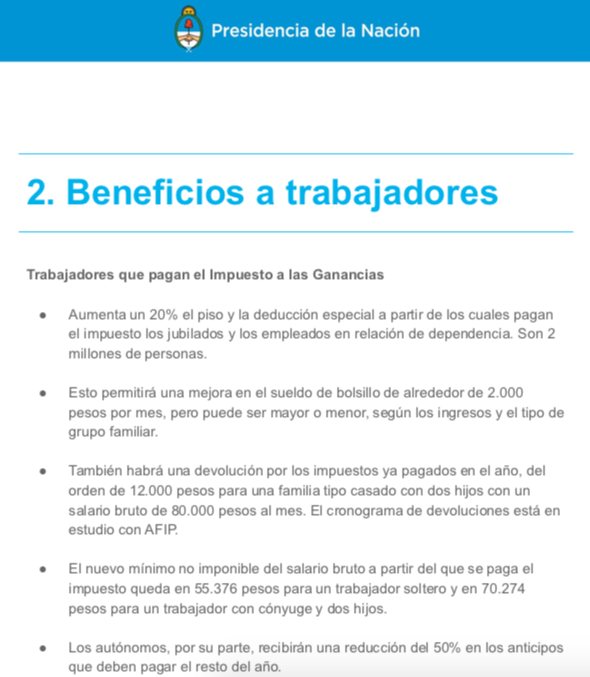 Macri dijo que habrá modificaciones en el impuesto a las Ganancias (“recibirán 2 mil pesos más por mes”) y “mejoras” para los trabajadoresformales e informales; estatales y privados; en relación de dependencia o cuentapropistas.