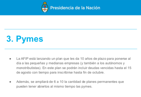 “Queremos ayudar a las pymes porque reconocemos su valor: estamos lanzando un plan para pagar en 10 años sus obligaciones con la AFIP”, indicó.
