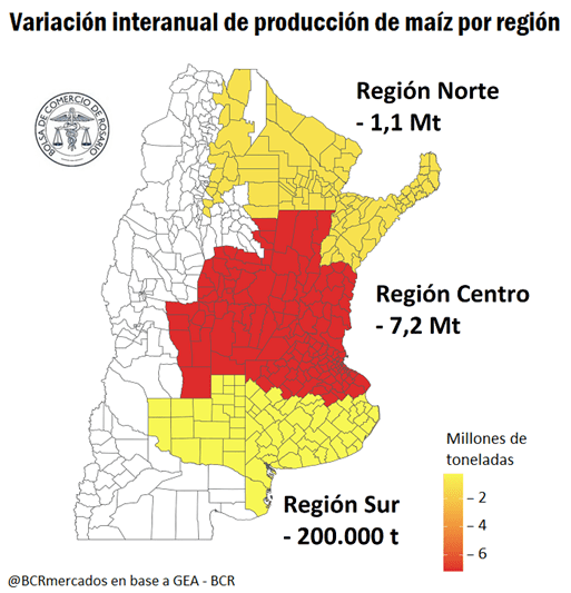 En relación con la nueva campaña de maíz, según las últimas proyecciones se espera que la producción disminuya en las tres regiones, siendo la Región Norte y Centro las más afectadas, con caídas en torno al 20%. La Región Sur, en tanto, beneficiada en mayor medida por el escaso patrón de lluvias, exhibiría una disminución más acotada, del orden del 3%. Tales guarismos implican una producción de 4,4 Mt, 30,2 Mt y 8,0 Mt para cada región, respectivamente, totalizando 42,5 Mt a nivel nacional.