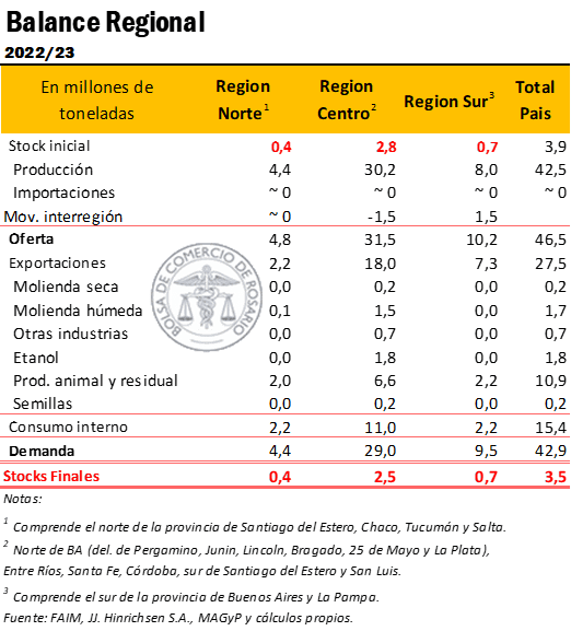 Por último, se proyecta que para la 2022/23 los stocks finales a nivel nacional disminuyan un 10% hasta 3,5 Mt. De éstos, el 71% quedará en plantas y silos de la región central, cayendo en relación a los 2,8 Mt del ciclo anterior. En el norte y sur, en cambio, el carry para la campaña que sigue se mantendría relativamente estable con relación a la campaña previa, con 0,4 y 0,7 Mt, respectivamente.