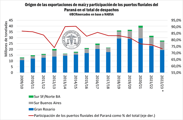 Por otro lado, como mencionamos anteriormente, se estima que las exportaciones a nivel país disminuyan en un 21,4% hasta las 27,5 Mt (vs. 35,0 Mt en la 21/22), aunque con gran variabilidad intrarregional. Por un lado, tenemos que la Región Norte y la Región Centro destinarán a exportación 2,2 y 18,0 Mt, respectivamente, lo que constituyen caídas de 32% y 23% en comparación con la campaña anterior. Por su lado, la Región Sur totalizaría 7,3 Mt en tal concepto, con una caída interanual sustancialmente menor, en torno al 12%. Esto trae aparejada la reducción de la participación de los puertos fluviales del Paraná en los despachos totales, tendencia que se ha acrecentado en los últimos dos ciclos, de la mano de las dificultades productivas y la caída en el nivel del agua del Río Paraná, vía de salida al Océano.