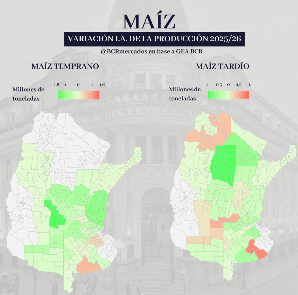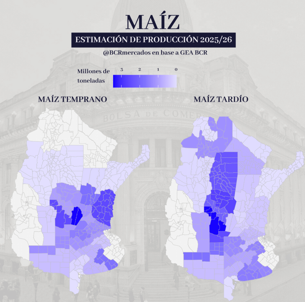 La oferta de maíz temprano se concentrará principalmente en la región central del país. Zona Núcleo, Entre Ríos y el área de influencia de la delegación Rafaela aparecen como los principales polos de producción. En contraste, el maíz tardío seguirá dominando en el norte y el centro-oeste, con fuerte presencia en Santiago del Estero, oeste de Córdoba, San Luis y La Pampa.