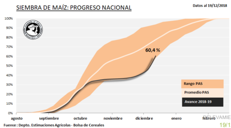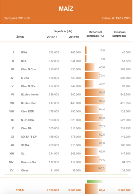 Por otro lado, nuevas precipitaciones mantienen las reservas hídricas de los perfiles. Sin embargo, las tormentas provocaron daños puntuales por granizo en el centro del país. A la fecha, el avance de siembra cubrió el 60,4 % de las 5.800.000 hectáreas proyectadas, en números absolutos se incorporaron más de 3,5 MHa. de maíz con destino grano comercial a lo largo de toda el área agrícola.