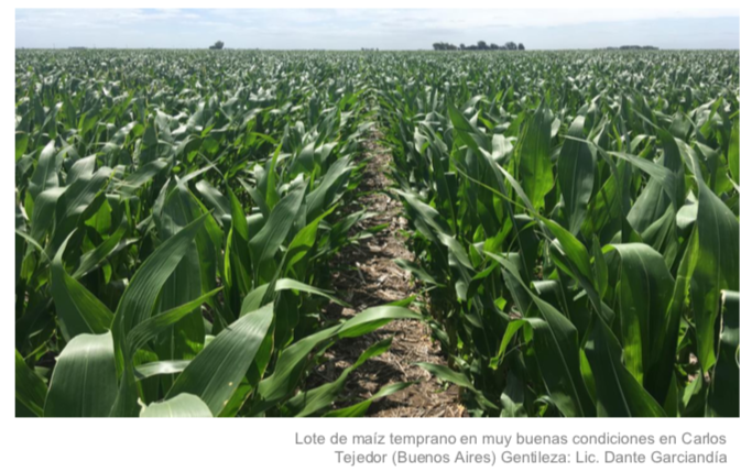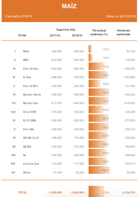 Promediando la ventana de siembras tardías en el centro y sur del área agrícola nacional, la incorporación de cuadros de maíz continuó a muy buen ritmo. Las labores comenzaron a tomar fluidez en las provincias del norte del país, donde las reservas hídricas son adecuadas. Por otro lado, la siembra de lotes de segunda ocupación sobre rastrojos de fina también releva un buen avance. El avance a la fecha se ubica en el 73 %, ya habiéndose incorporado más de 4,2 MHa. Frente a este panorama mantenemos la proyección de siembra de maíz con destino grano comercial para la campaña 2018/19 en 5.800.000 Ha.