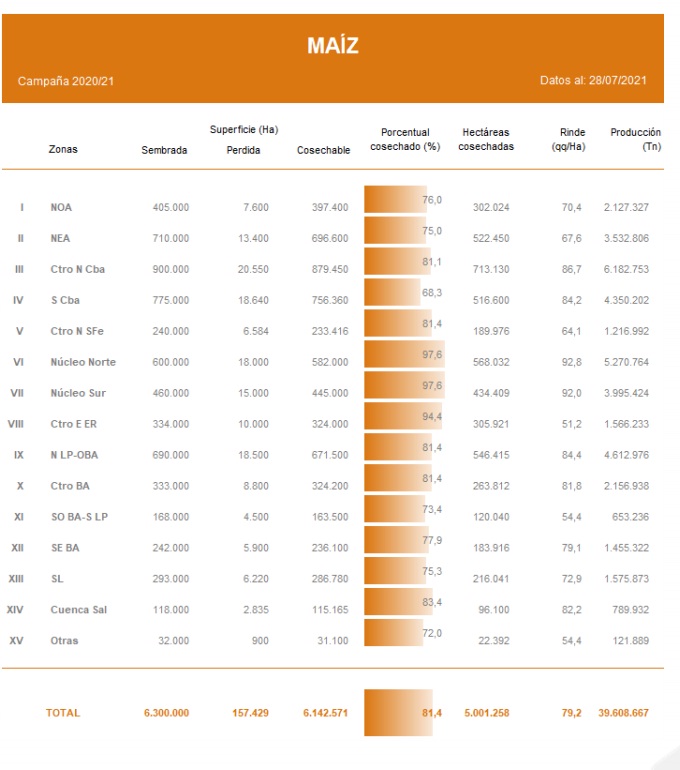 El avance de recolección nacional es del 81,4 % del área apta. Se mantiene la estimación de producción de 48 MTn, 3,5 MTn menos que la campaña previa (Producción ciclo 2019/20: 51,5 MTn).
