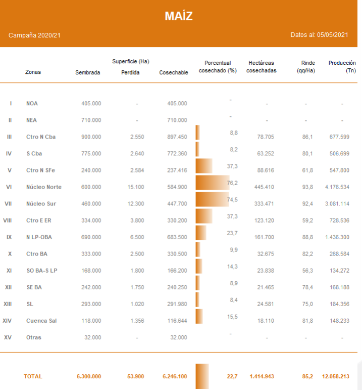 La mejora en las condiciones de piso en lotes y caminos permitió que las labores de cosecha tomen impulso en gran parte del área agrícola nacional. En el caso del maíz, la recolección aún mantiene una importante demora en comparación al ciclo previo, ya que los productores priorizan la cosecha de soja. Por otro lado, gran parte de los cuadros sembrados durante los meses de diciembre y enero se encuentran con niveles de humedad en los granos por sobre los óptimos de cosecha. Se espera que durante la segunda mitad de mayo comience la recolección de estos planteos.