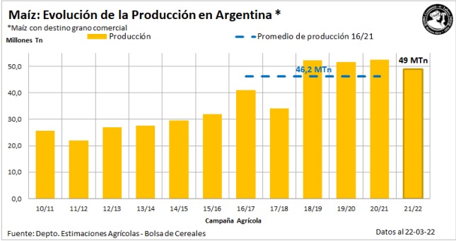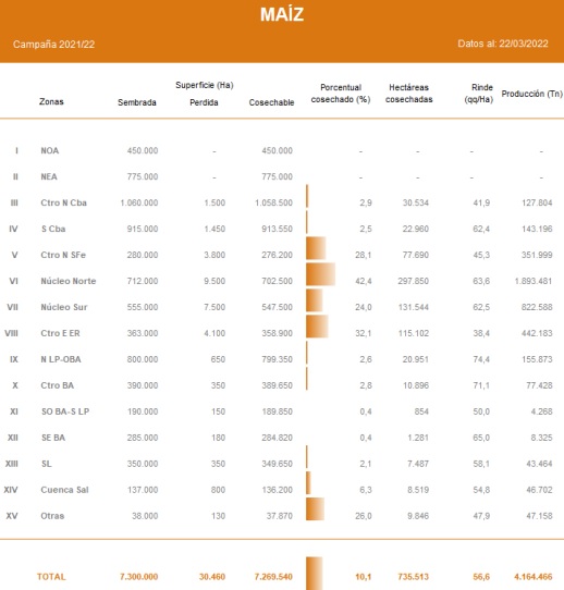 Luego de relevar un avance intersemanal en las labores de 3,2 pp, ya se recolectó el 10,1 % del área apta en todo el país. Desde muestro informe previo la recolección de maíz con destino grano comercial continúo brindando rindes por debajo de las expectativas iniciales. La característica transversal a todas las zonas PAS donde se está cosechando el cereal, es la heterogeneidad de las productividades. La misma es consecuencia de las lluvias irregulares registradas durante el período crítico de los cuadros. Frente a este panorama, nuestra nueva proyección de producción para la campaña 2021/22 es de 49 MTn, 2 MTn menos que nuestra última publicación.