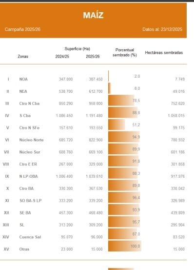 Con este marco, y si las condiciones climáticas continúan acompañando, el maíz avanza en la campaña con perspectivas favorables, apoyado en un desarrollo homogéneo de los lotes y en una oferta de humedad que resulta determinante para consolidar el potencial productivo, especialmente en las zonas más avanzadas del ciclo.