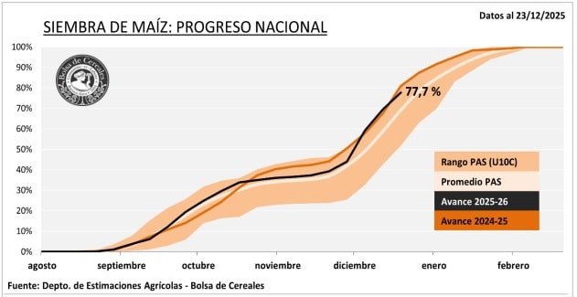 De acuerdo con el último informe de seguimiento a nivel nacional, la siembra de maíz con destino a grano comercial ya cubre el 77,7 % del área proyectada, confirmando un progreso firme y sostenido de las labores. Las precipitaciones recientes y las reservas de humedad adecuadas permiten un correcto establecimiento de los lotes, incluso en regiones que comienzan a transitar momentos clave del ciclo.