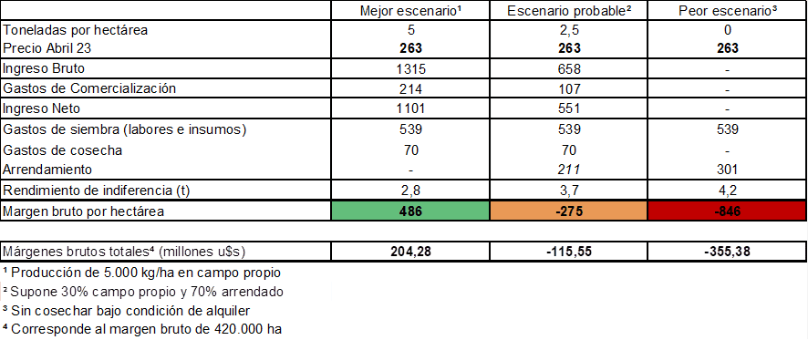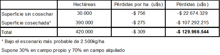 Escenario probable: en base a las estimaciones del cultivo de 2.500 kg/ha y suponiendo que 30% se trata en campo propio y 70% se realiza en campo alquilado, los ingresos de la cosecha no son suficientes para enfrentar los costos de la actividad, arrojando pérdidas brutas de casi 300 u$s/ha.