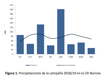 La lluvias de noviembre (Figura 1) favorecieron el rendimiento del trigo candeal (4120 kg ha1). La cosecha de trigo se realizó el 18 de diciembre y la primera fecha de siembra de maíz se efectuó el 21 de diciembre sobre suelo seco. Producto de la escasez de precipitaciones la primera fecha se registró el 28 de diciembre, porque la germinación no se desencadenó hasta que iniciaron las precipitaciones el 29 de diciembre.