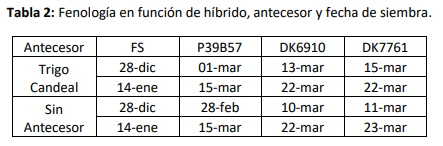 Las etapas fenológicas observadas (Tabla 2) mostraron que el desarrollo del cultivo resultó acorde con las fechas de siembra y con las longitudes de ciclo evaluadas. El híbrido corto (P39B57) en siembra temprana (28-dic) logró alcanzar la etapa de estigmazón hacia fines de febrero. En cambio, el resto de las combinaciones evaluadas lograron la floración en el mes de marzo. A medida que se retrasa la floración son esperables menores tasas de crecimiento por el descenso estacional de la temperatura y la radiación, y un incremento en el riesgo de daño por heladas tempranas. Por otro lado, la interferencia por la presencia de trigo candeal produjo un pequeño retraso de la estigmazón, principalmente en la primera fecha de siembra (Tabla 2). Además, la interferencia produjo una mayor amplitud de la etapa de fecundación, observada por el retraso de la necrosis de los estigmas en las parcelas sembradas sobre antecesor candeal (observación visual).