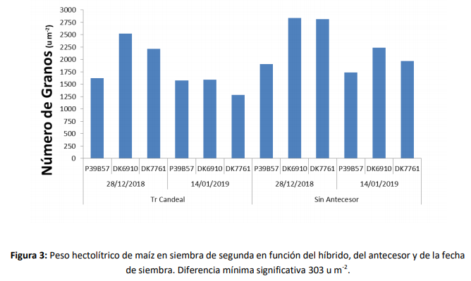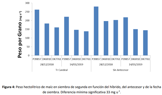 En promedio, el rendimiento del cultivo de maíz de segunda estuvo asociado positivamente con el número de granos (r 2=0,59; p<0,01) y con el peso por grano (r2=0,54; p><0,01). Para los ciclos largos con antecesor trigo candeal (con interferencia), el atraso de la fecha de siembra determinó mermas de rendimiento, producto de una reducción del número de granos por unidad de superficie y del peso por grano (14-ene vs 28 dic.: -40% NG; -17% PG; Fig. 3 y 4). En cambio, en el ciclo corto el atraso de la fecha de siembra afectó principalmente el peso por grano (14-ene vs 28 dic.-3% NG; – 15,5% PG; Fig. 3 y 4). En cambio, en el ciclo corto el atraso de la fecha de siembra afectó principalmente el peso por grano (14-ene vs 28 dic.-3% NG; – 15,5% PG; Fig. 3 y 4). Por otro lado, para los tres híbridos evaluados, la merma de rendimiento por interferencia de trigo candeal fue significativa (Fig. 2) y resultó principalmente por una reducción del número de granos (con antecesor vs sin antecesor: -20% NG; -7% PG; Fig. 3 y 4).