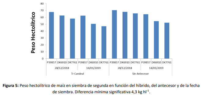 Este trabajo tiene el objetivo de contribuir con información agronómica para adecuar el manejo del cultivo de maíz de segunda en la región sur de la provincia de Buenos Aires. Durante la campaña 2018-19, en la CEI Barrow, se evaluó la longitud de ciclo, la fecha de siembra y la interferencia de trigo candeal sobre el cultivo de maíz de segunda. Se sembraron los híbridos de maíz DK6910 y AX7761 (ciclo largo), y P39B57 (ciclo corto), con una densidad de 4 pl m2 . Las fechas de siembra resultaron el 28/12/2018 y el 14/01/2019. Para determinar el efecto interferencia, en cada fecha de siembra el maíz se sembró sobre parcelas con antecesor trigo candeal y sobre parcelas sin antecesor. Se fertilizó con 80 kg DAP ha-1 en la línea de siembra y con 140 kg de UREA ha-1 , aplicada al voleo previo a la primera fecha de siembra del maíz. Se utilizó un diseño anidado por fecha de siembra y por antecesor, con tres repeticiones. El análisis estadístico se realizó con INFOSTAT.