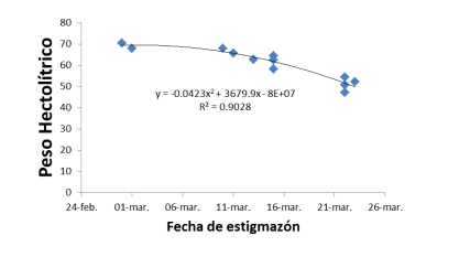 Las condiciones meteorológicas adversas para el llenado de grano son frecuentes en los cultivos de segunda. En maíz de segunda, el peso hectolítrico es una de las principales limitantes para alcanzar una adecuada calidad comercial. La campaña evaluada no fue excepción y el peso hectolítrico se vio afectado (Fig. 5). El atraso de la fecha de siembra y el incremento en la longitud de ciclo determinaron un atraso de la fecha de estigmazón. Este atraso en la fecha de estigmazón se relacionó inversamente con el peso hectolítrico final (Fig. 6). Es decir, las limitaciones durante la etapa de llenado que determinaron un menor peso por grano y un menor rendimiento, también malograron el peso hectolítrico. Por lo tanto, según estos resultados, debería programarse la estigmazón de los cultivos con límite en inicio de marzo (manejo de la fecha de siembra y longitud de ciclo).