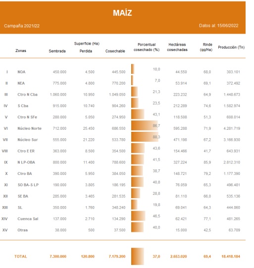 En el sur del área agrícola, las labores de recolección se concentran sobre los planteos sembrados durante la primavera. Lon rindes registrados muestran una marcada heterogeneidad producto del estrés termo-hídrico sufrido por parte de los lotes esta campaña. Hacia el norte del país, la cosecha de cuadros del cereal mantiene buenos avances en las regiones NOA y NEA. A medida que la humedad de los lotes descienda a niveles óptimos para su recolección, se espera que se aceleren los avances de las máquinas.