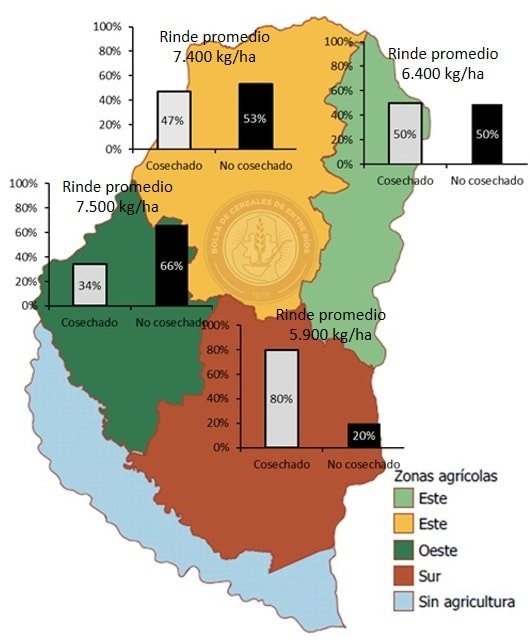 Región Oeste: presenta el menor progreso de recolección, con apenas el 34% del área cosechada, aunque exhibe los mejores resultados productivos, con rindes promedio de 7.500 kg/ha.