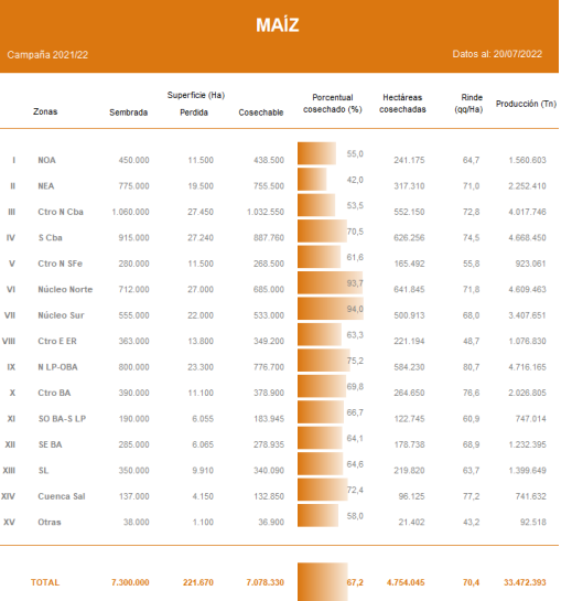 Las buenas condiciones de tiempo registradas durante las últimas semanas impulsan la cosecha de cuadros de maíz con destino grano comercial en todo el país. Los productores concentran las labores sobre lotes que fueron sembrados durante los meses de diciembre y enero. Luego de registrar un importante avance intersemanal en la recolección de 9,1 puntos porcentuales, ya se cosechó el 67,2 % del área apta en toda el área agrícola. A la fecha el rinde medio nacional se ubica en 70,4 qq/Ha, marcando una reducción intersemanal de 0,2 qq. Frente a este panorama, mantenemos nuestra proyección de producción para la campaña 2021/22 en 49.000.000 Tn.