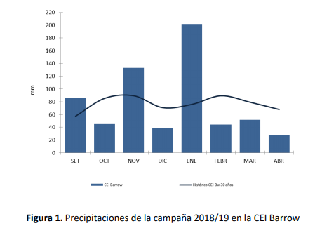 Continuando con los ensayos iniciados en el año 2008, durante la campaña 2018-19 se sembraron maíz y girasol como alternativas al cultivo de soja de segunda. La siembra se realizó sobre un cultivo de trigo candeal. Se implantaron híbridos de maíz DK6910 y AX7761 (ciclo largo), y P39B57 (ciclo corto). De girasol se sembró el híbrido SYN3970 y de soja la variedad Nidera 4209. Los cultivos de maíz y girasol se sembraron a una densidad de 4 pl m-2 y soja con 25 pl m-2 . Se fertilizó con 80 kg DAP ha-1 en la línea de siembra y con 140 kg de UREA ha-1 al voleo previo a la siembra de segunda.