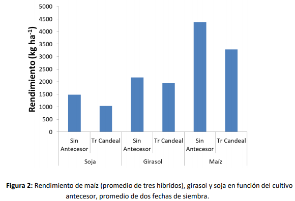 El efecto de interferencia por antecesor, donde se comparó la performance de los cultivos de segunda versus la condición sin antecesor en la misma fecha, resultó significativo (Fig. 2). En términos relativos, el cultivo más afectado por la presencia previa de trigo candeal fue soja, luego maíz y en menor medida girasol (pérdida de rendimiento relativo: soja -30%; maíz -25% y girasol – 11%). Estos resultados no son afines a la plasticidad esperada para el cultivo de soja, la cual se vio afectada por el deterioro de las condiciones ambientales de marzo. No obstante, los resultados son coherentes y consecuentes con la escasez de recursos, producto del escaso tiempo de barbecho entre cultivos, y con un atraso fenológico ocurrido en las parcelas con antecesor. Al igual que por atraso en la fecha de siembra (párrafos anteriores), este atraso fenológico por antecesor (+2 a 3 días) desencadenó mermas de rendimiento principalmente en soja y en maíz (Figura 1). No obstante, la fenología solo justificó una parte menor de la pérdida total producto del efecto antecesor, correspondiendo a la escasez de recursos la mayor parte de la reducción del rendimiento.