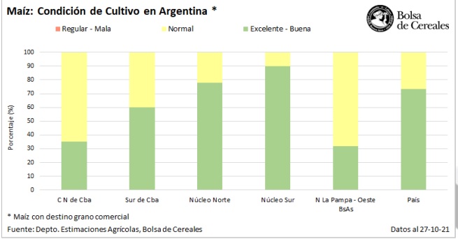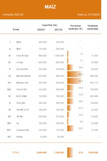 Mientras los cuadros más adelantados del cereal expanden hojas, continuó la siembra de maíz con destino grano comercial en el centro y sur del área agrícola nacional. La incorporación de lotes avanza sobre sectores con buena humedad en los primeros centímetros del perfil. Luego de relevar un progreso intersemanal en las labores de apenas 1,3 puntos porcentuales, el avance de siembra registrado se ubica en el 27,6 % de nuestra proyección de 7.100.000 Ha para la campaña 2021/22. Esta superficie representa, en números absolutos, 500.000 Ha más que las implantadas la campaña previa (Ciclo 2020/21: 6,6 MHa).