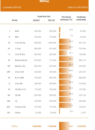 La siembra del cereal ya cubre el 70,7 % de la actual proyección de 7,3 MHa para el ciclo 2021/22, que representa un incremento de área interanual de 7,6 %. Los avances registran una demora entre campañas de 4,1 pp