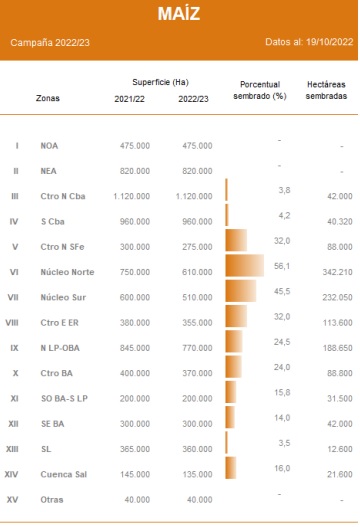Hacia la provincia de Córdoba, la falta de lluvias demora la emergencia de los cuadros del cereal sembrados durante octubre. Sobre las zonas Centro-Norte de Santa Fe y Centro-Este de Entre Ríos, se relevaron los lotes más adelantados de maíz, los cuales ya transitan estadios entre V2 y V4. En los Núcleos Norte y Sur el déficit hídrico impide concretar los planes de incorporación de maíz temprano cuando solo resta una semana de ventana de siembra en ambas zonas productivas.
