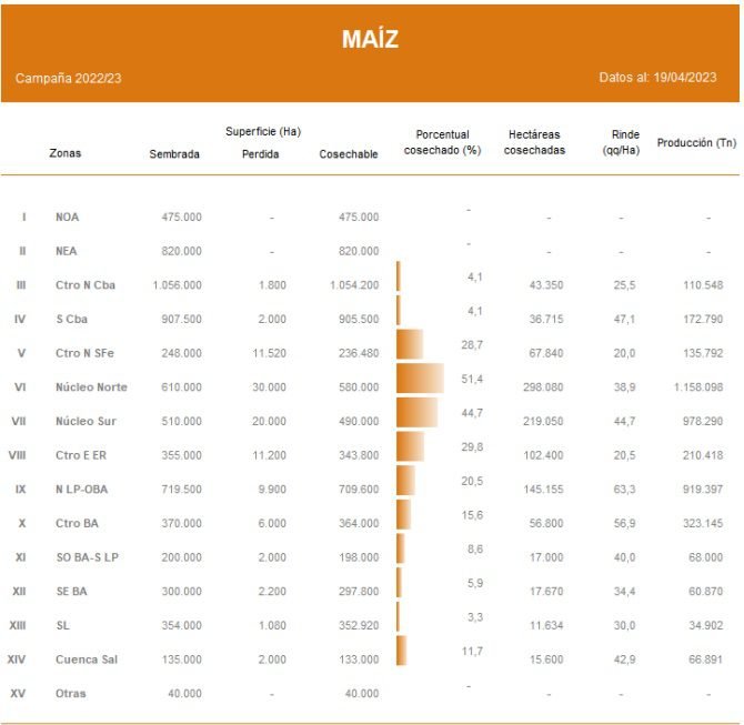 Desde nuestro informe previo, la baja en la humedad de los granos permitió que las labores de cosecha de maíz con destino grano comercial avancen a buen ritmo. Al igual que sucede desde el inicio de la recolección del cereal, las productividades muestran una alta heterogeneidad. A la fecha el avance nacional se ubica en 14,7 % del área apta, marcando un rinde medio nacional de 41,1 qq/Ha. Frente a este panorama, mantenemos nuestra proyección de producción para la campaña 2022/23 en 36 MTn. Este volumen representa en números absolutos, 16 MTn menos que las recolectadas la campaña anterior (Campaña 2021/22: 52 MTn)