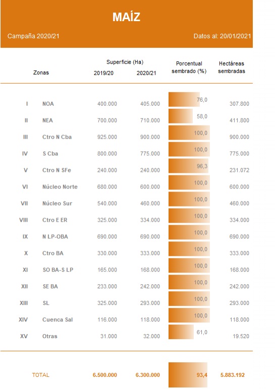 La siembra cubre el 93,4 % de la actual proyección de 6,3 MHa para el ciclo 2020/21. El avance intersemanal fue de 2,5 pp, con una demora de 1,3 pp en comparación a la campaña previa.