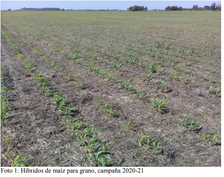 El ensayo se realizó en el campo de la Escuela Inchausti situada en la localidad de Valdés, partido de 25 de Mayo, Buenos Aires (35° 37’ 26,42” S – 60° 33’ 19,12” O). El suelo del lote es un Hapludol Típico con 2,2 % de materia orgánica, 17 mg kg-1 de fósforo extractable y un pH de 5,8. El cultivo antecesor fue soja de primera. El diseño del ensayo fue en parcelas apareadas de 5 surcos por 150 m de longitud para cada híbrido (Foto 1), con un testigo (Duo 30 PWU) para la corrección del rendimiento. Aproximadamente dos meses antes de la siembra, se aplicó 1,5 kg ha-1 de glifosato 74 % y 0,5 l ha-1 de 2,4D 80 %. La siembra fue en directa el 24 de septiembre de 2020, con una distancia entre surcos de 70 cm y fertilización en la línea con 100 kg ha-1 de fertilizante que disponía de 40 % de fósforo, 12 % de nitrógeno, 10 % de azufre y 1 % de zinc. En pre emergencia se aplicó 0,5 kg ha-1 de glifosato 74 %, 2 l ha-1 de atrazina 50 %, 0,35 l ha-1 de herbicida con thiencarbazone, isoxaflutole y cyprosulfamida y 0,7 l ha-1 aceite antievaporante. En estado fenológico v5 se fertilizó al voleo con 200 kg ha-1 de urea (46-0-0) y en v9 se aplicó foliarmente 5 l ha-1 de fertilizante con 18 % de nitrógeno y 7 % de calcio.