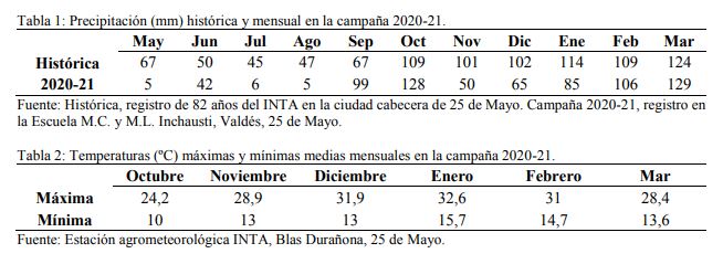 Se registraron las precipitaciones (Tabla 1) y las temperaturas máximas y mínimas (Tabla 2) durante el ciclo del cultivo.
