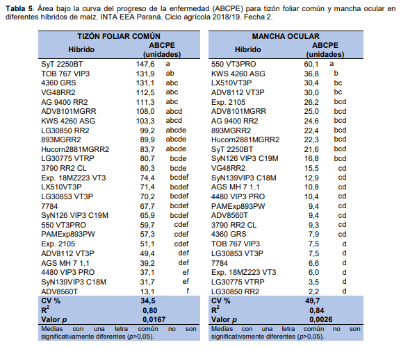 Los primeros síntomas de MO se observaron a principios de marzo, principalmente en hojas del estrato superior, al estado fenológico V11-V12. Los mismos consistieron en pequeñas manchas, circulares a ovales, con un centro claro rodeado de un anillo más oscuro y con un halo amarillento, semejante a la forma de un ojo (Figura 3C). Este patógeno prefiere tiempo húmedo (lluvias frecuentes o rocío persistente) y fresco (14-17°C), mientras que un incremento en la temperatura detiene el desarrollo de la enfermedad. En la primera evaluación (19/03/19, 57 dds), la prevalencia fue del 100% y el 96% de los híbridos presentó el 100% de incidencia. En la tercera y última fecha de evaluación (30/04/19, 99 dds) la severidad estuvo comprendida entre 0,13 (Exp. 18MZ223VT3) y 3,9% (550 VT3PRO), valores considerados bajos. El ABCPE permitió discriminar el comportamiento de cada genotipo frente a la MO, siendo 550 VT3PRO y LG30850 RR2 los híbridos de mayor y de menor susceptibilidad a dicha enfermedad, respectivamente (Tabla 5).