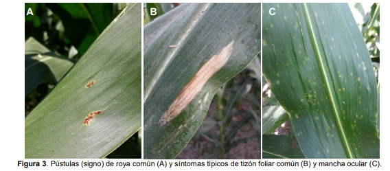 La RC, caracterizada por las pústulas alargadas de color herrumbroso oscuro y presencia de restos de tejidos epidérmicos (Figura 3), fue la principal enfermedad registrada en F1 (Figura 3A). La única evaluación realizada determinó una prevalencia del 100%, incidencia entre 20 y 100% y muy bajos niveles de severidad que no superaron el 0,2% (datos no presentados). Estos niveles de severidad probablemente se debieron, entre otros factores, a las elevadas temperaturas y a la ausencia de inóculo. La RC requiere un óptimo de 16-25°C y 5-6 h de mojado foliar, siendo de lenta evolución o sin desarrollo con 32°C o más. P. sorghi es un hongo biotrófico y las infecciones primarias en cada ciclo agrícola se originan a partir de esporas procedentes de otros lotes o de maíces voluntarios (guachos).