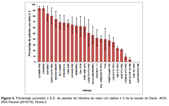 La incidencia de SF varió entre híbridos al considerar el porcentaje de plantas con daños ≥ 3 (escala de Davis; F=12,23; p < 0,0001). Los híbridos de maíz con tecnología Viptera 3 se destacaron por sobre las otras tecnologías, en relación a la incidencia de Sf. Los híbridos TOB767VIP3 y SyN139VIP3C18M no fueron dañados, mientras que el híbrido SyN126VIP3C19M presentó un 4,17% de plantas con daño ≥ 3. Los materiales con tecnología VT3 PRO mostraron un rango muy amplio de porcentaje de plantas con daño ≥ 3, desde 9,17% (LG30853VT3PRO) a 80,33% (ADV8112VT3PRO). Los mayores porcentajes de plantas con daño ≥ 3 se observaron en los materiales LG30850RR2, VG48RR2 y ADV 8560T sin tecnología Bt (Figura 4). Cabe destacar que, al analizar las categorías de daño, la mayoría de ellas se concentraron en los grados 4, 5 y 6 de la escala de Davis, por lo que los porcentajes de daños 7, 8 y 9 fueron comparativamente bajos.