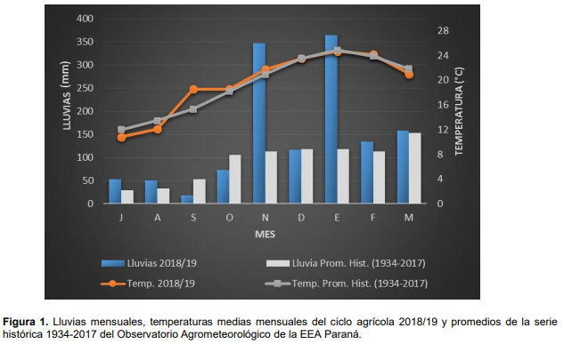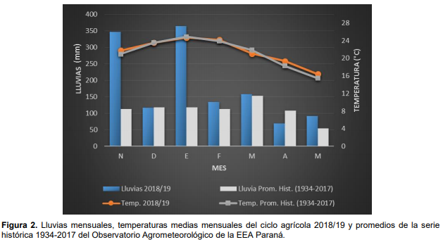 El ciclo agrícola estival 2018/19 se caracterizó por temperatura medias mensuales semejantes a las históricas, con la excepción del mes de septiembre que fue 3°C más cálido y generó una emergencia rápida y uniforme del cultivo (Figura 1).