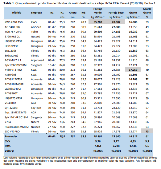 La producción de biomasa verde y seca promedio fue de 78.801 kg MV ha-1 y 23.640 kg MS ha-1 , respectivamente y el rendimiento promedio de grano fue de 14.312 kg MS ha-1 . El 46 % de los híbridos superaron el promedio del ensayo. El aporte medio de grano a la materia seca total fue de 61% (Tabla 1).