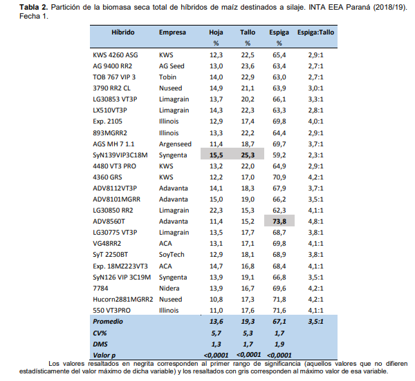 Los híbridos presentaron diferencias en la partición de la materia seca de hoja, tallo y espiga, con valores promedios de 13,7 % en hoja, 19,5% en tallo y 67,1% en espiga. La contribución de los diferentes componentes morfológicos a la biomasa total de la planta varió entre híbridos: 15,6% (SyN139VIP3C18M) a 10,8% (Hucorn2881MGRR2) de hoja, 25,3% (SyN139VIP3C18M) a 15,2% (ADV8560T) de tallo y 73,8% (ADV8560T) a 59,1% (SyN139VIP3C18M) de espiga (Tabla 2).