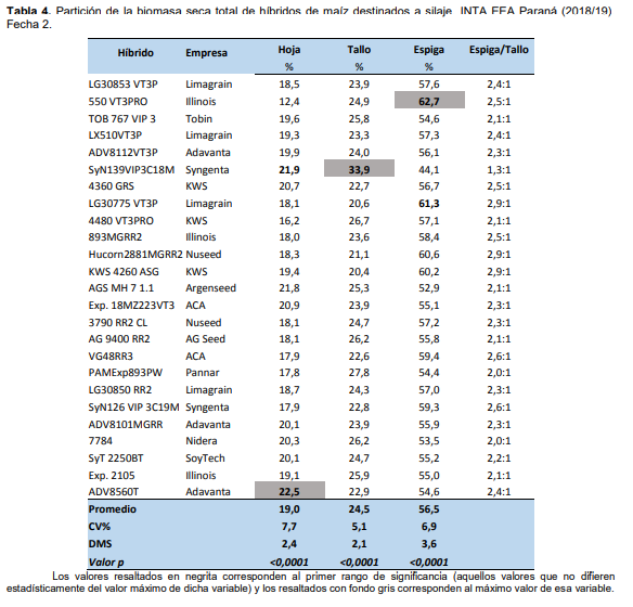 Los híbridos presentaron diferencias en la partición de la materia seca de hoja, tallo y espiga, con valores promedios de 19,0% en hoja, 24,5 en tallo y 56,5% en espiga. La contribución de los diferentes componentes morfológicos a la biomasa total de la planta varió entre híbridos: 22,0% (SyN139VIP3C18M) a 12,0% (550VT3PRO) de hoja, 33,9% (SyN139VIP3C18M) a 20,4% (KWS4260ASG) de tallo y 62,7% (550VT3PRO) a 44,1% (SyN139VIP3C18M) de espiga (Tabla 4).