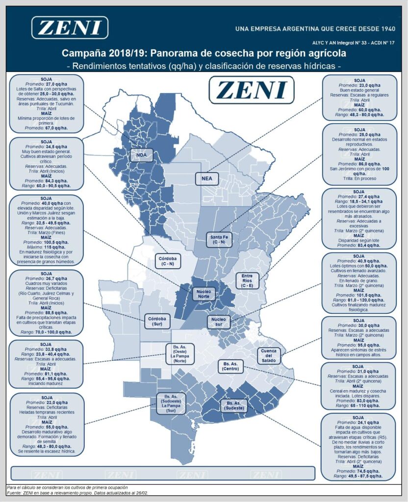 Paralelamente, la corredora Zeni elaboró un mapa sobre rindes promedio esperados en soja y maíz en todo el país. En el caso de Córdoba, el relevamiento arrojó lo siguiente: