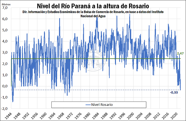 Durante el mes de agosto, la bajante del Paraná se agravó y el nivel promedio a la altura de Rosario fue -12 cm, llegando a alcanzar un mínimo de -33 cm, el menor registro desde septiembre de 1970. Esto se encuentra considerablemente por debajo de los 2,47 Mt que deben registrarse para que la empresa encargada del dragado se vea obligada a garantizar los 34 pies de calado.
