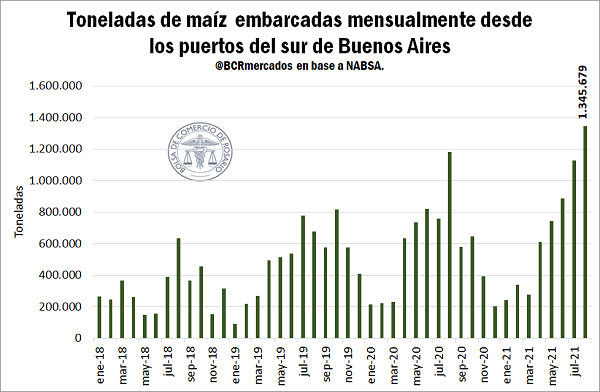 Este mayor volumen de embarques responde principalmente a los mayores despachos de maíz. En los meses de julio y agosto se terminó de cosechar el maíz tardío, por lo que ingresó un elevado volumen de grano al mercado que debió encontrar en los puertos del sur bonaerense su vía de salida. En total, desde las terminales portuarias de todo el país se embarcaron 4,5 Mt de granos amarillos durante el último mes, el segundo mayor volumen mensual del 2021. Los puertos del sur de Buenos Aires despacharon 1,35 Mt de maíz en el último mes, el mayor volumen mensual de la historia.