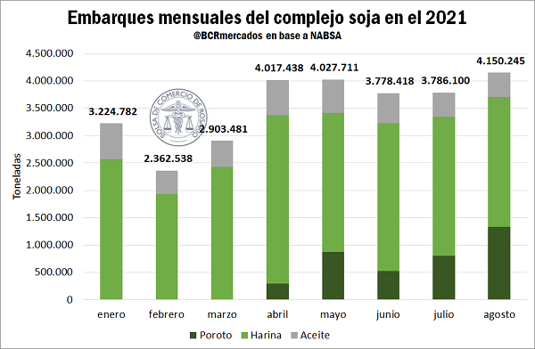 Por el lado del complejo soja, los embarques en conjunto alcanzaron un máximo en agosto con 4,2 Mt de poroto, harina y aceite, aunque poseen diferencias hacia el interior de cada producto. El poroto y la harina exhibieron un comportamiento contrario al que se venía observando hasta el momento. Los embarques de poroto en agosto totalizaron 1,3 Mt, un 65% más que durante julio y el mayor volumen mensual desde junio del 2020. En cuanto a los puertos de origen, 645.000 t se despacharon desde las terminales del sur bonaerense, mientras que 618.000 lo hicieron desde el Gran Rosario y 64.000 desde el norte de Buenos Aires/ sur de Santa Fe.