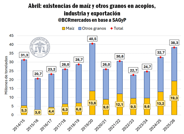 El escenario actual muestra un cambio estructural en la composición de las existencias agrícolas. Al 1° de abril, los stocks totales de granos alcanzan 38,3 Mt, cerca de máximos históricos.