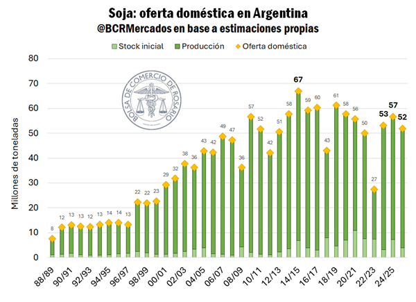 El problema está en el arranque: los stocks iniciales son los más bajos en una década (exceptuando años de sequía), lo que lleva la oferta total a 52 Mt, un 8% por debajo del promedio histórico.