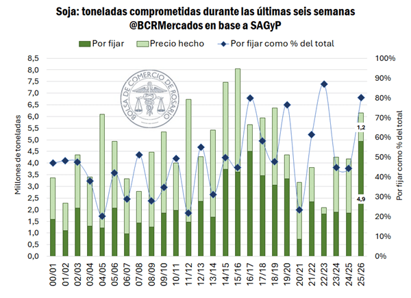 El dinamismo comercial también acompaña. Los compromisos por la campaña 2025/26 alcanzan 21,9 Mt, un volumen que se ubica 42% por encima del promedio de la última década y representa el 33% de la producción proyectada.