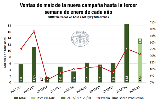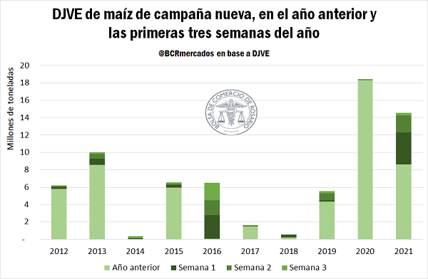 Asimismo, resulta remarcable que en lo que va de enero, el volumen declarado asciende a casi 6 Mt. Este es el segundo mayor monto anotado en las tres primeras semanas de enero de cada año, solamente superado por lo ocurrido en el 2016, cuando se declararon 6,4 Mt en igual lapso. Cabe aclarar que el gran volumen anotado en ese momento coincidió con la eliminación del sistema de ROE Verde para limitar los despachos del maíz así como también del cobro de derechos para exportación de maíz.